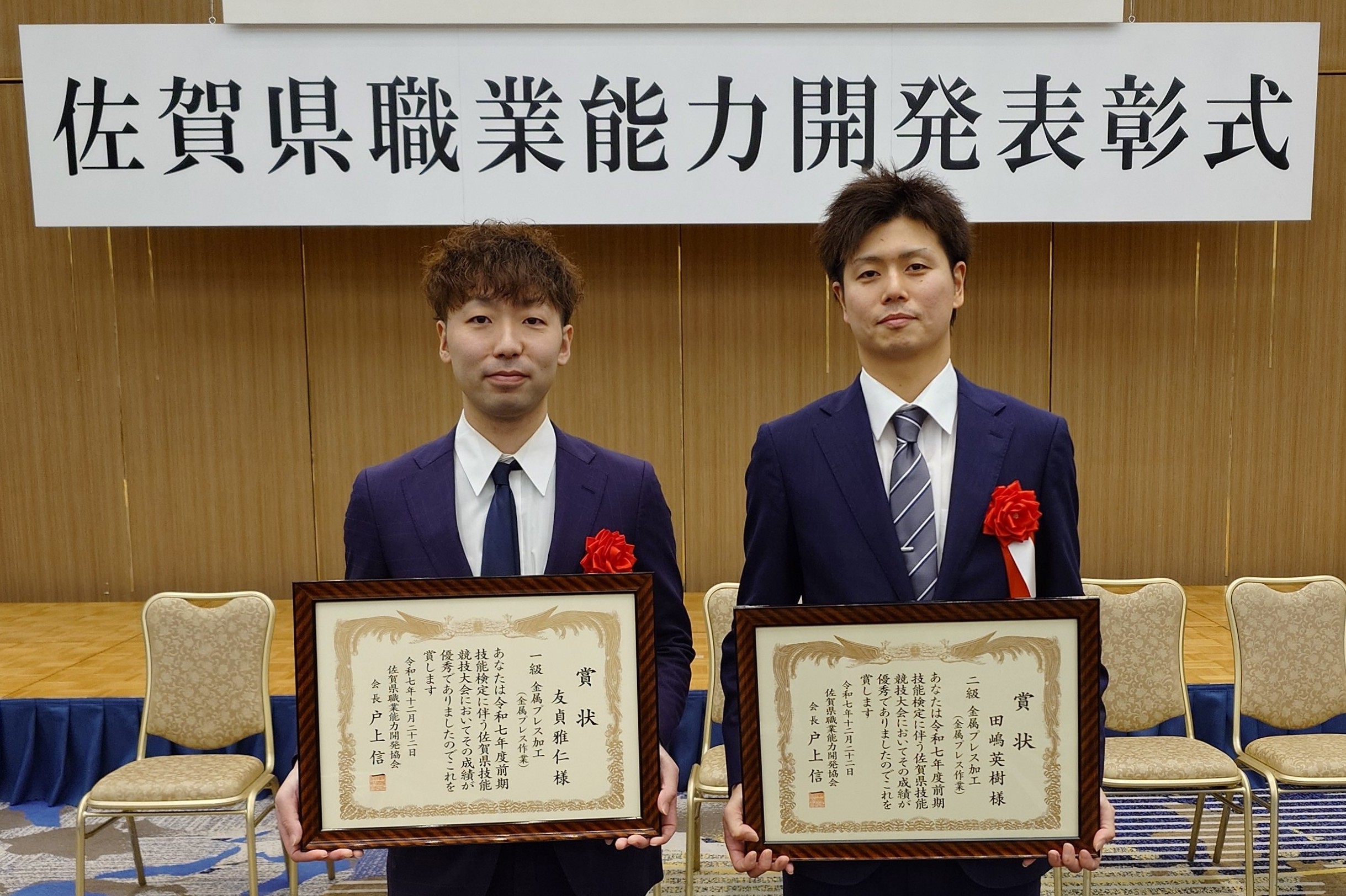 令和7年度前期佐賀県技能競技大会(金属プレス加工1級・金属プレス加工2級)において友貞雅仁と田嶋英樹が成績優秀者として職業能力開発協会会長賞を受賞しました。